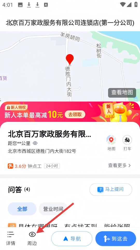 2、在北京百萬家政服務(wù)有限公司連鎖店(第一分公司)詳情頁,點擊【周邊】按鈕,查看店鋪周邊信息。