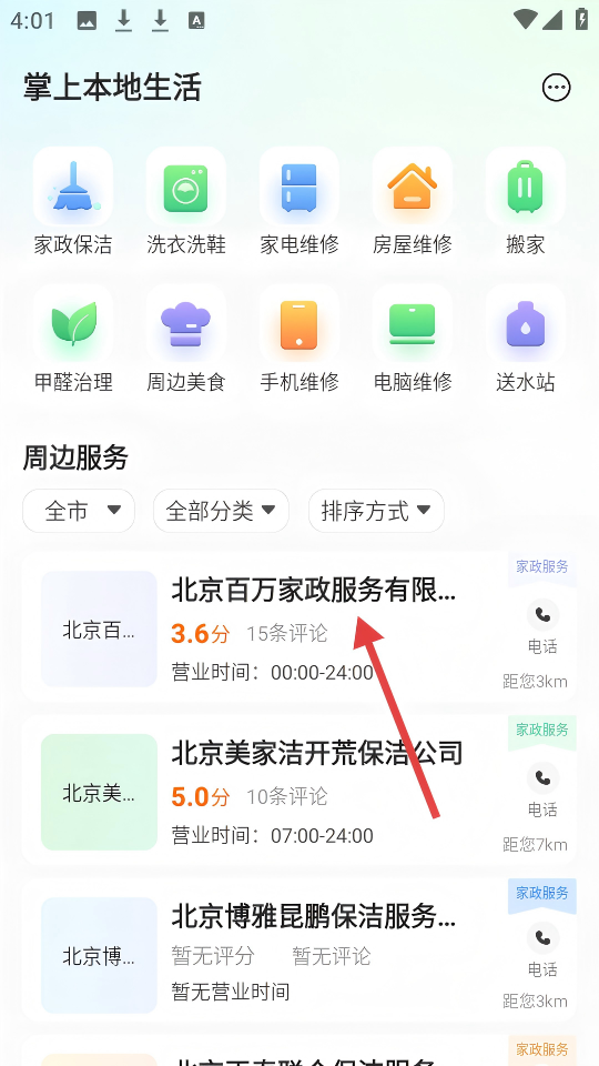 1、在掌上本地生活頁面,點擊【北京百萬家政服務(wù)有限公司連鎖店(第一分公司)】,進入該店鋪詳情頁。