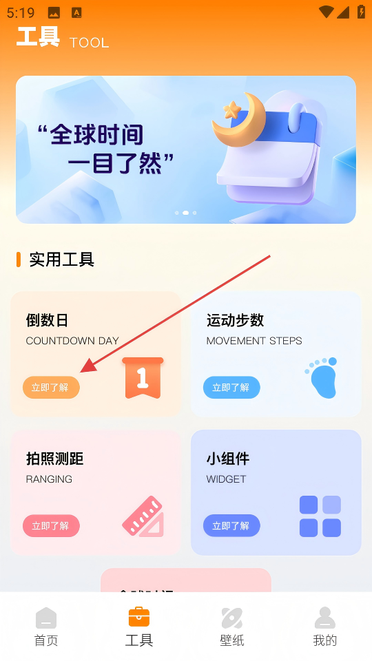 3、在工具頁面,點擊“倒數(shù)日”下方的【立即了解】,進入倒數(shù)日小組件設(shè)置頁面。