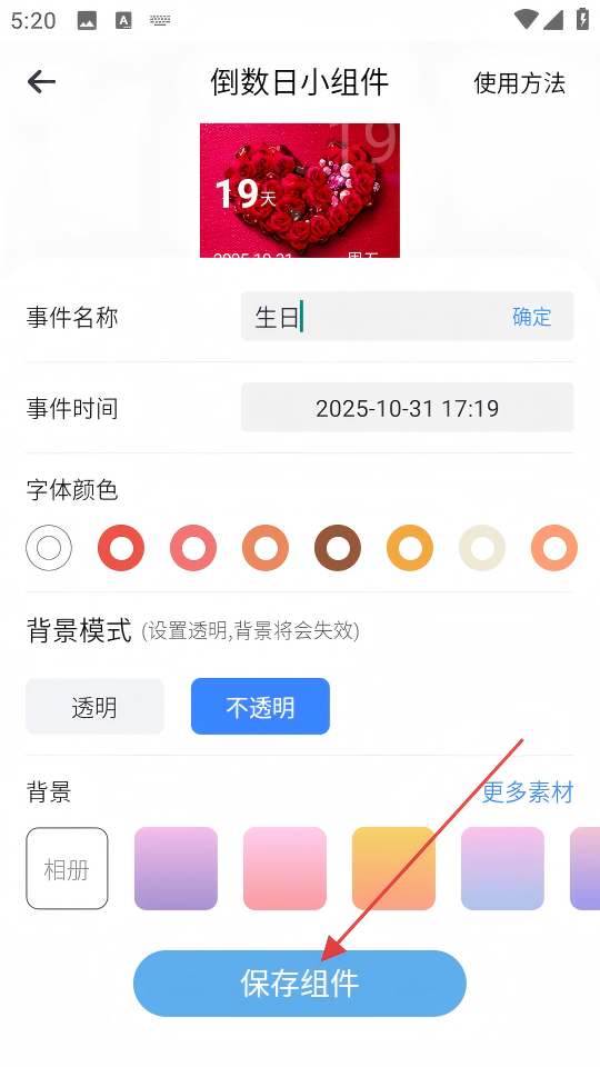4、在倒數(shù)日小組件設(shè)置頁,填寫事件名稱、選擇事件時間等后,點擊【保存組件】。