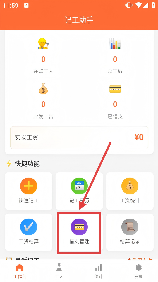 1、打開記工助手APP,在“工作臺(tái)”頁(yè)面點(diǎn)擊【借支管理】,進(jìn)入借支管理界面。