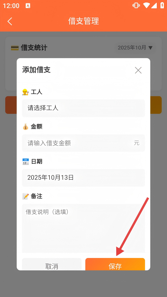 3、在窗口中選擇工人、輸入借支金額,確認(rèn)日期等信息后,點(diǎn)擊【保存】。