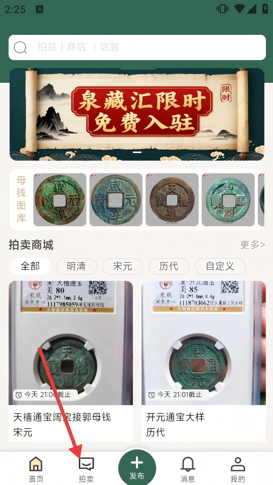 1、打開泉藏匯APP,點(diǎn)擊底部【拍賣】,進(jìn)入拍賣頁面。