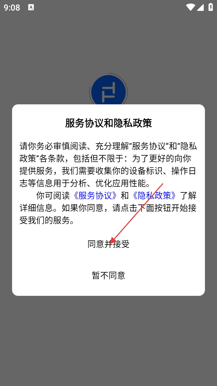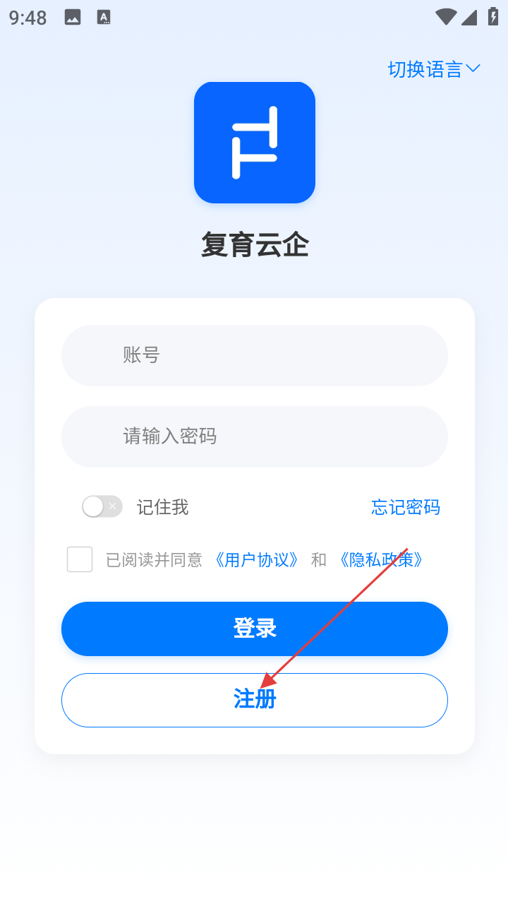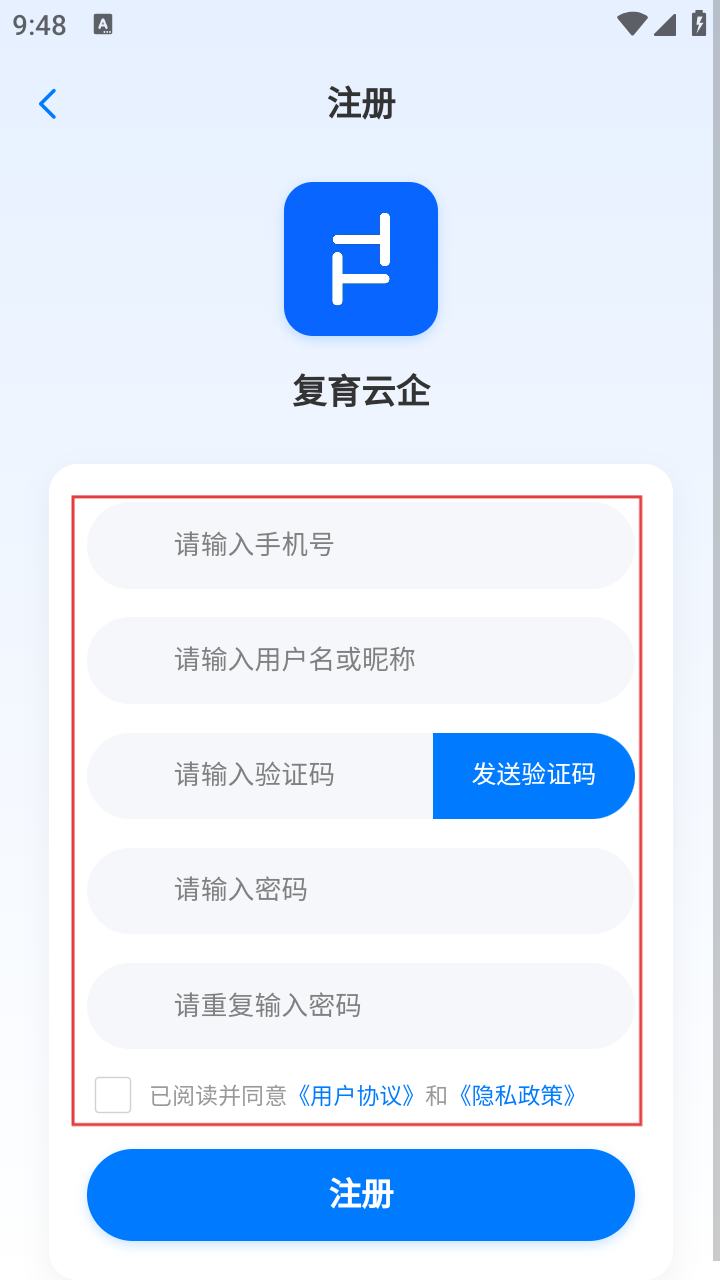 1、復(fù)育云企啟動后,彈出【服務(wù)協(xié)議和隱私政策】提示框,仔細閱讀后,點擊【同意并接受】,進入登錄相關(guān)界面。