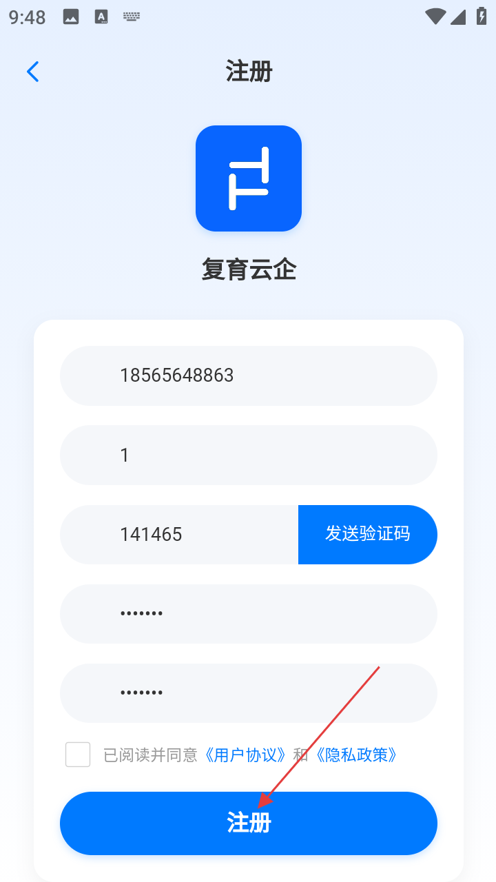 4、完成注冊信息填寫,勾選同意相關(guān)協(xié)議后,點擊藍色【注冊】按鈕,即可完成賬號注冊流程。