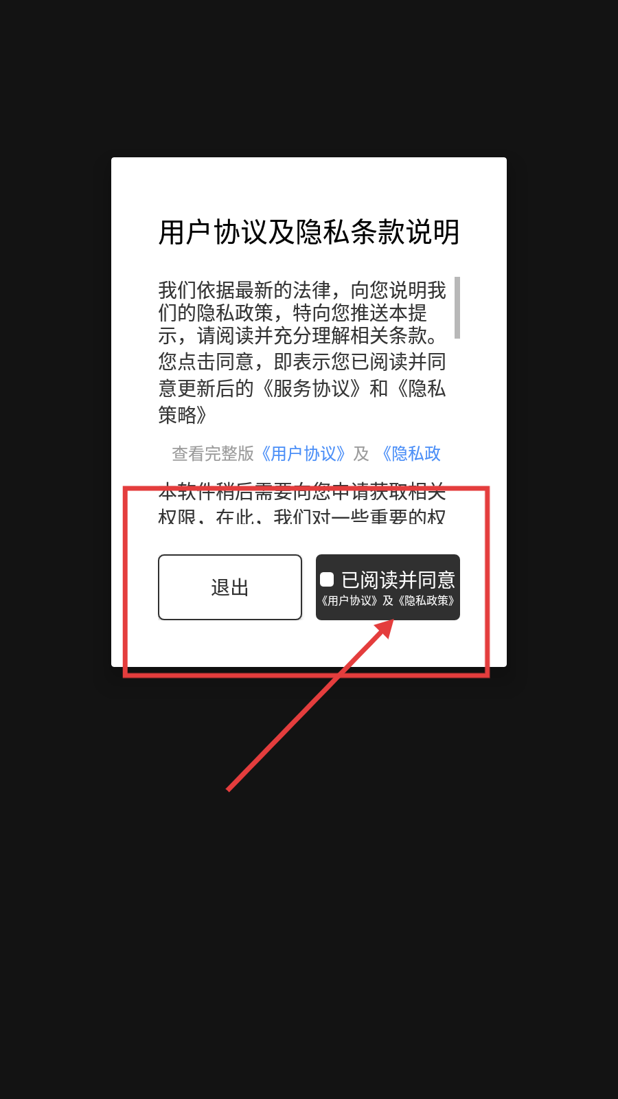 1、進入軟件時,會彈出【用戶協(xié)議及隱私條款說明】,需勾選【已閱讀并同意《用戶協(xié)議》及《隱私政策》】才能繼續(xù)使用。