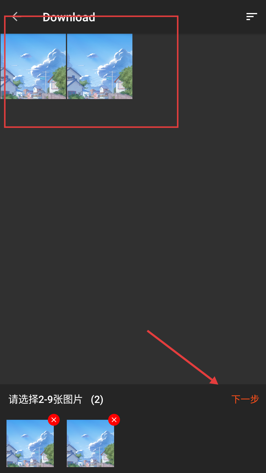 3、進入圖片選擇頁面后,挑選2-9張圖片,選好后點擊【下一步】,即可進入圖片編輯環(huán)節(jié)。