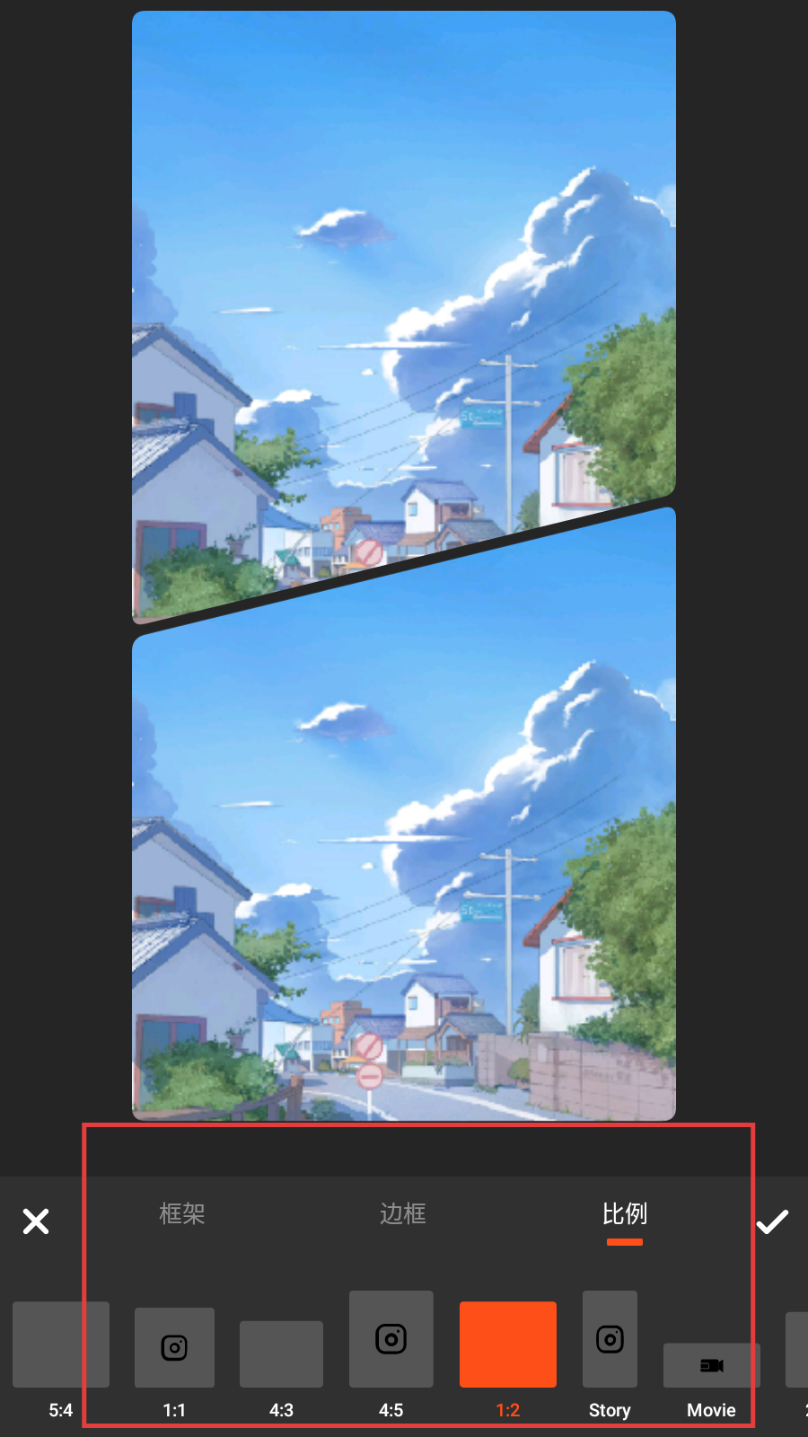 4、在圖片編輯頁面,底部有【框架】【邊框】【比例】等選項,可根據(jù)需求調(diào)整圖片比例等參數(shù)來編輯圖片。