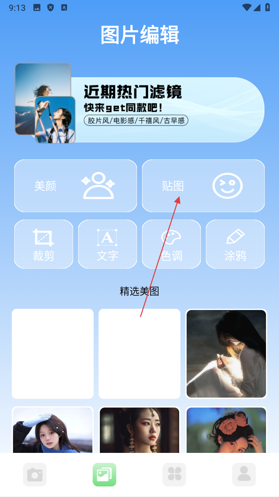 2、在圖片編輯頁面,點擊【貼圖】,進入我的相冊頁面。