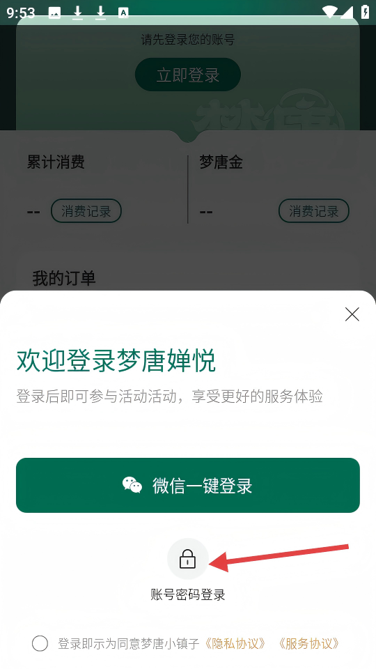 3、在【歡迎登錄夢(mèng)唐嬋悅】的彈窗中,點(diǎn)擊【賬號(hào)密碼登錄】選項(xiàng)。