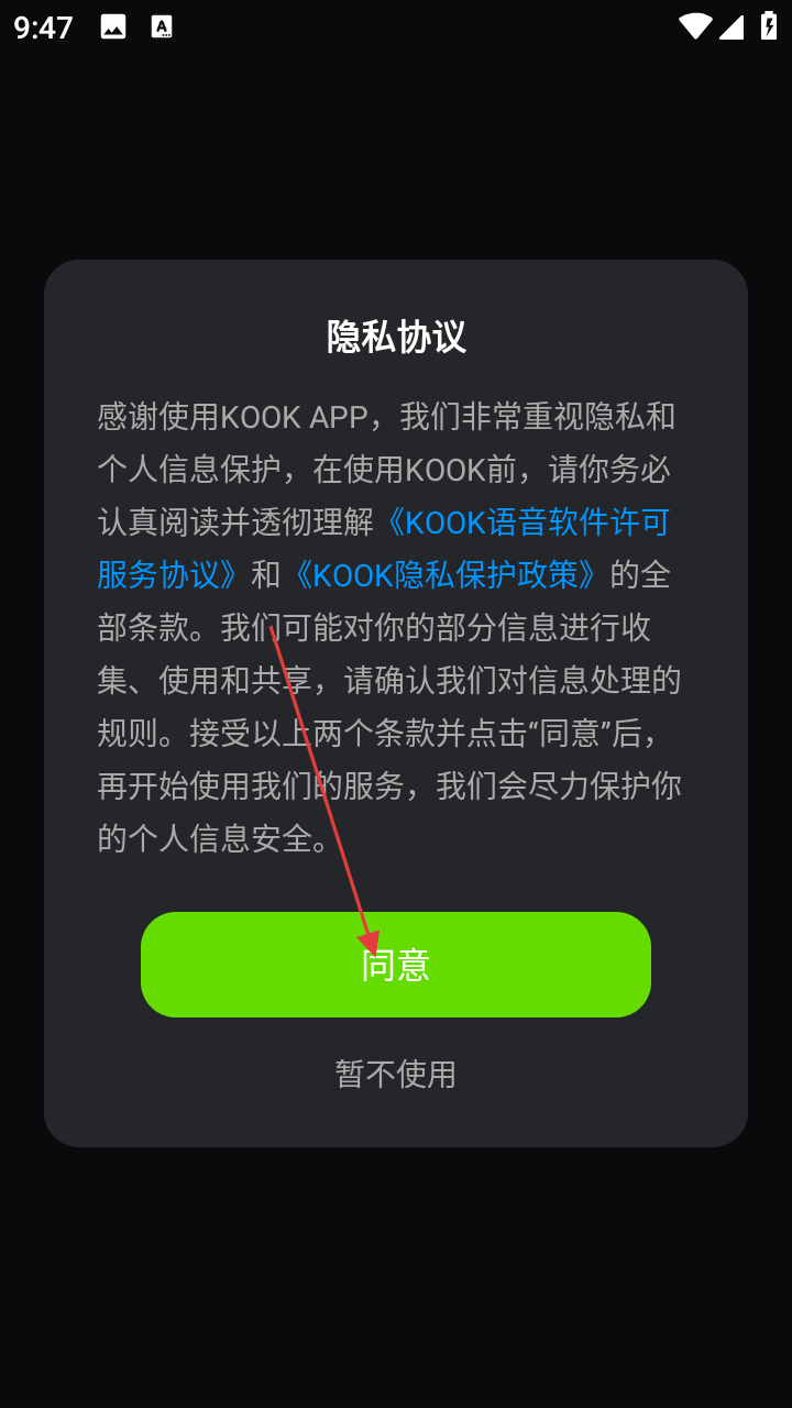 1、打開【KOOK】后,會彈出隱私協議提示,若同意相關條款,點擊【同意】按鈕。