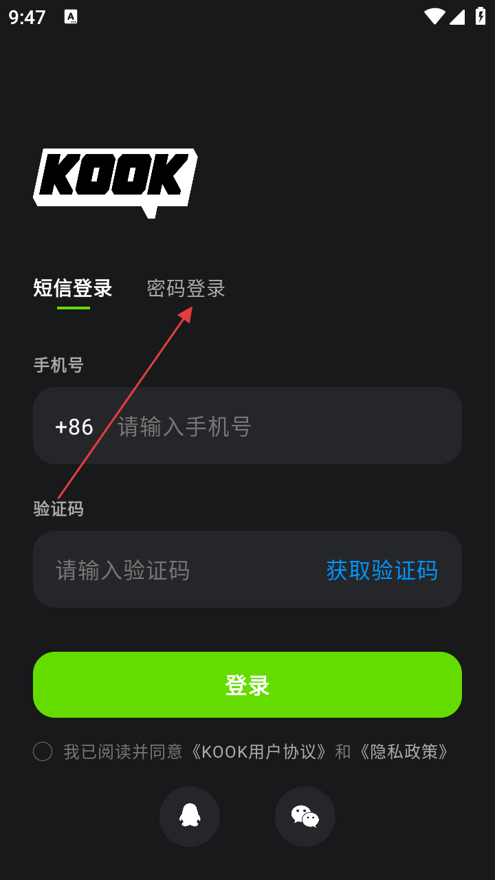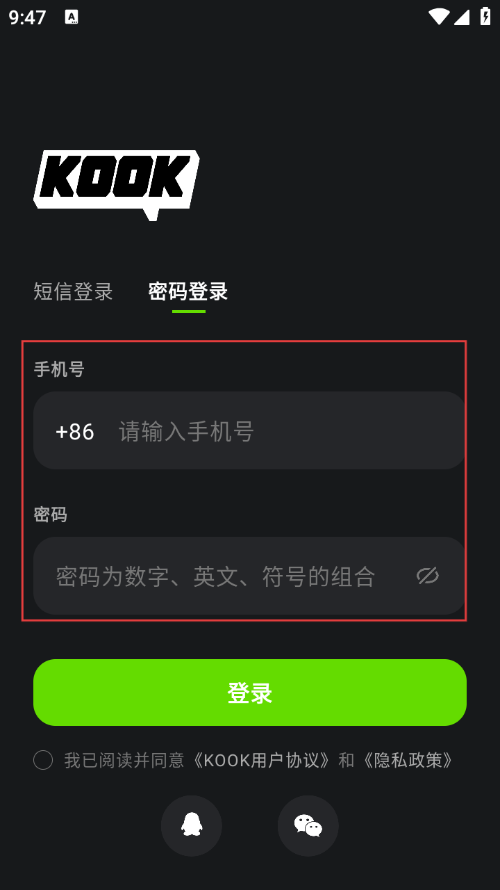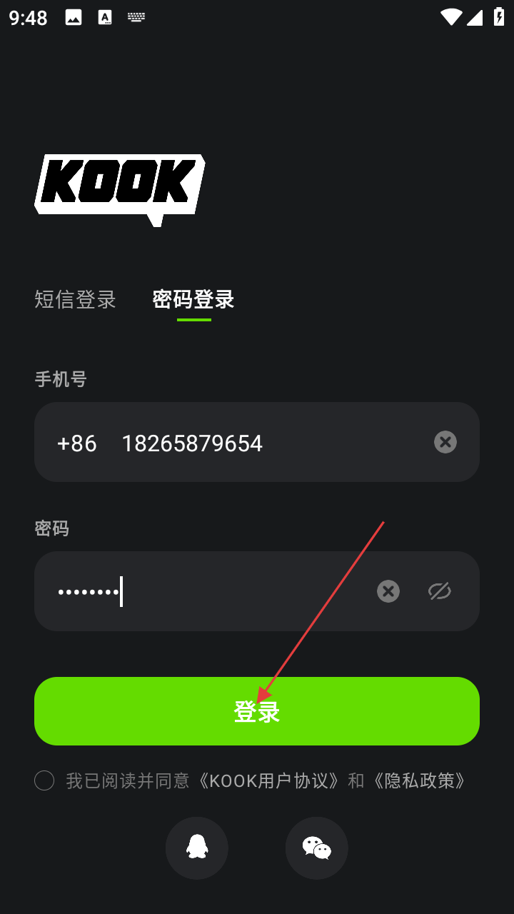 4、填好手機號和密碼后,勾選同意《KOOK用戶協議》和《隱私政策》,點擊【登錄】按鈕即可登錄。