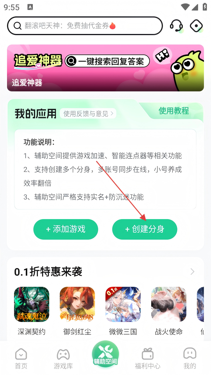2、進(jìn)入輔助空間頁面后,若要?jiǎng)?chuàng)建游戲分身,點(diǎn)擊【+創(chuàng)建分身】,進(jìn)入創(chuàng)建分身體面。
