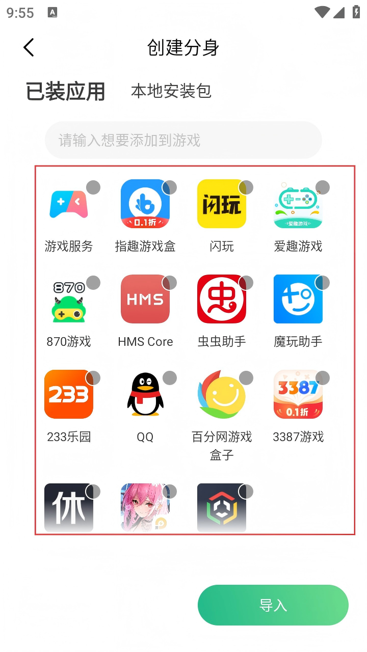 3、在創(chuàng)建分身體面,選擇要?jiǎng)?chuàng)建分身的已裝應(yīng)用,點(diǎn)擊【導(dǎo)入】,完成應(yīng)用分身導(dǎo)入操作。