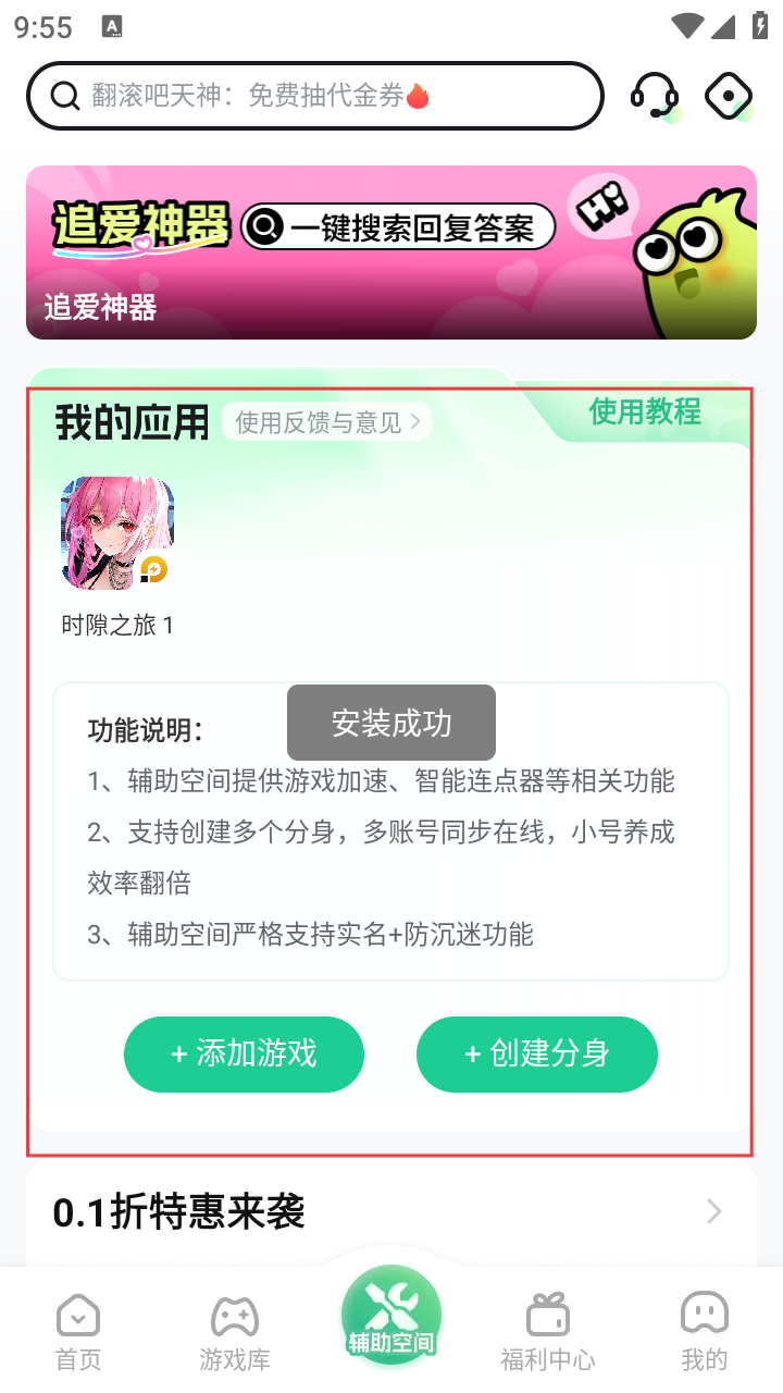 4、導(dǎo)入應(yīng)用后,在輔助空間頁面可查看已安裝的應(yīng)用分身,輔助空間還提供游戲加速等多種功能。