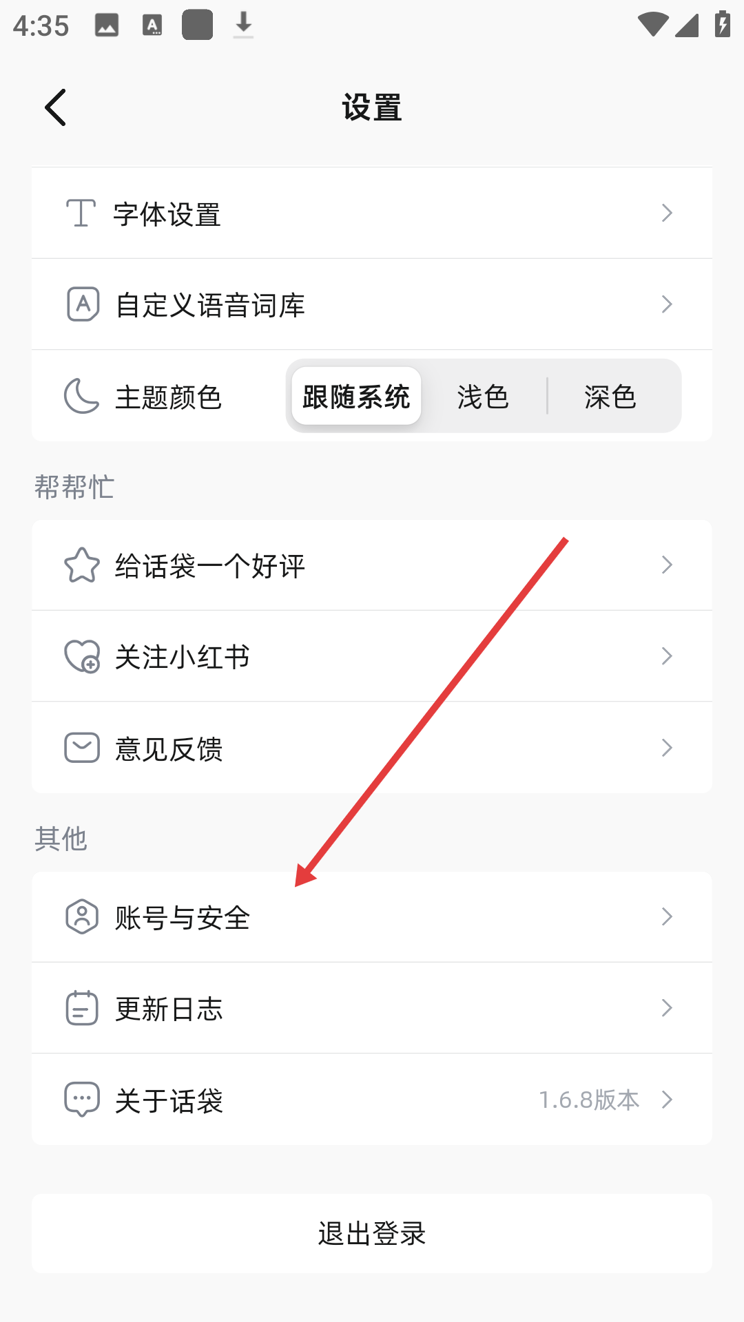 1、點擊右上角設(shè)置圖標(biāo),進入設(shè)置頁面,可查看字體設(shè)置、主題顏色、賬號與安全等選項。