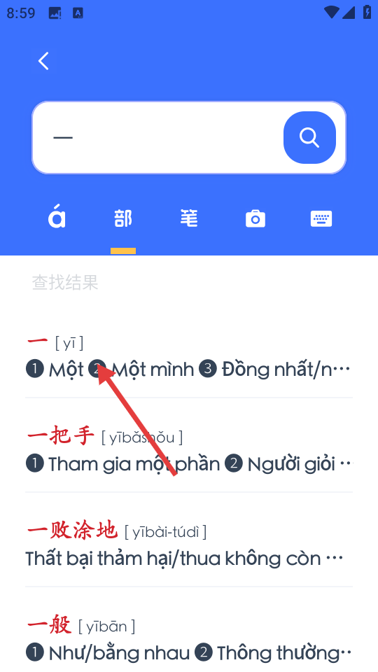 3、在查找結(jié)果中,點擊帶有【M?t】釋義的“一”詞條。