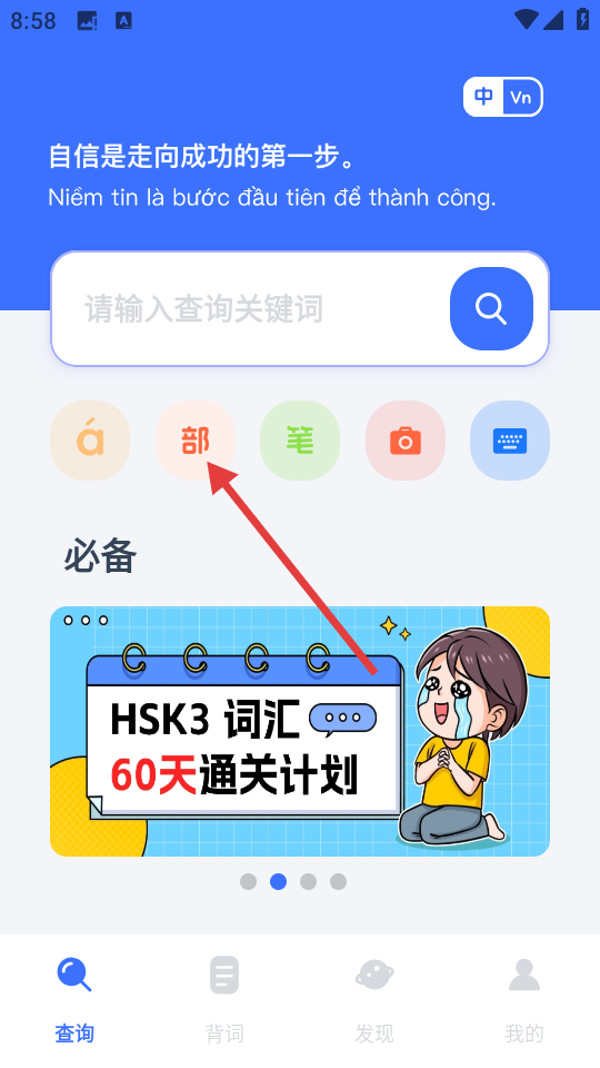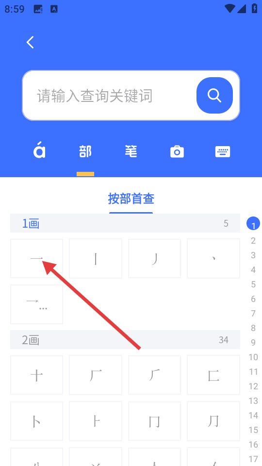 1、點擊【部】按鈕,進入按部首查詢的功能界面。