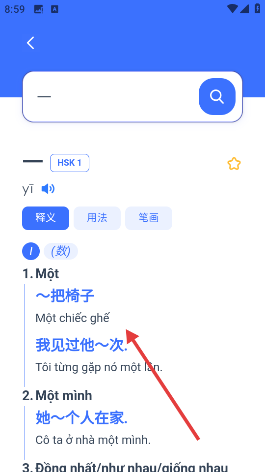 4、進入詞條詳情頁后,可查看【一】的釋義、用法、筆畫等信息,如“~把椅子”的雙語示例。
