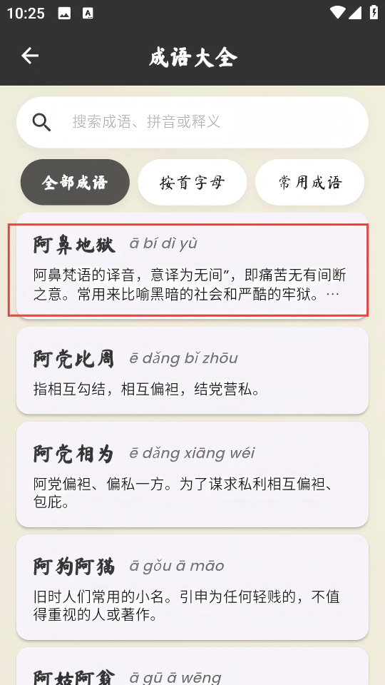 3、在成語列表中選擇【阿鼻地獄】,進(jìn)入該成語的詳情頁面。