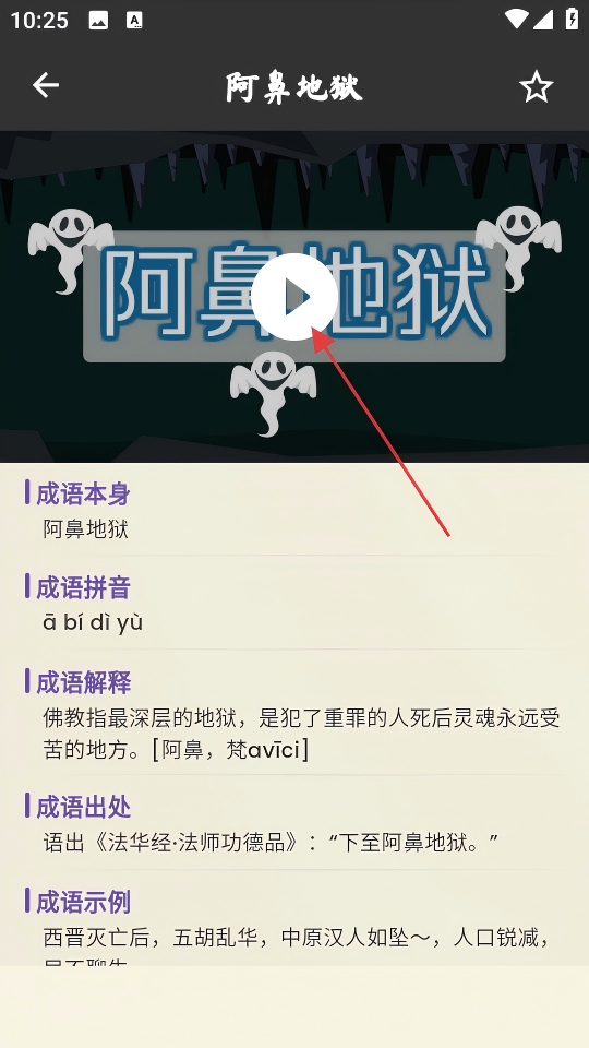 4、在詳情頁面點(diǎn)擊播放按鈕,即可收聽該成語的相關(guān)音頻內(nèi)容。