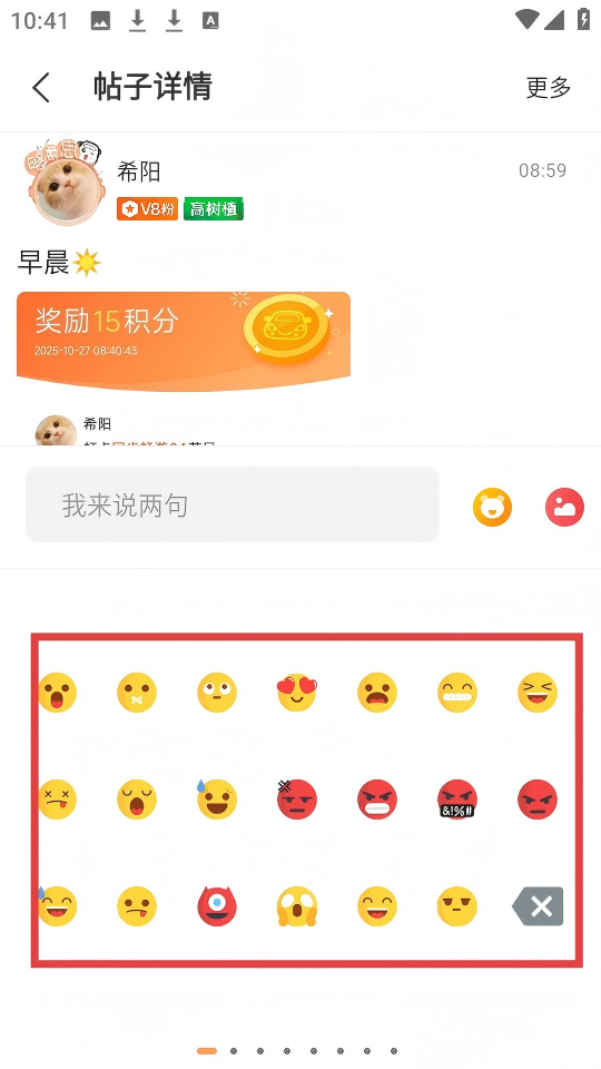 3、在【帖子詳情】頁點(diǎn)擊表情圖標(biāo),可打開表情選擇界面。