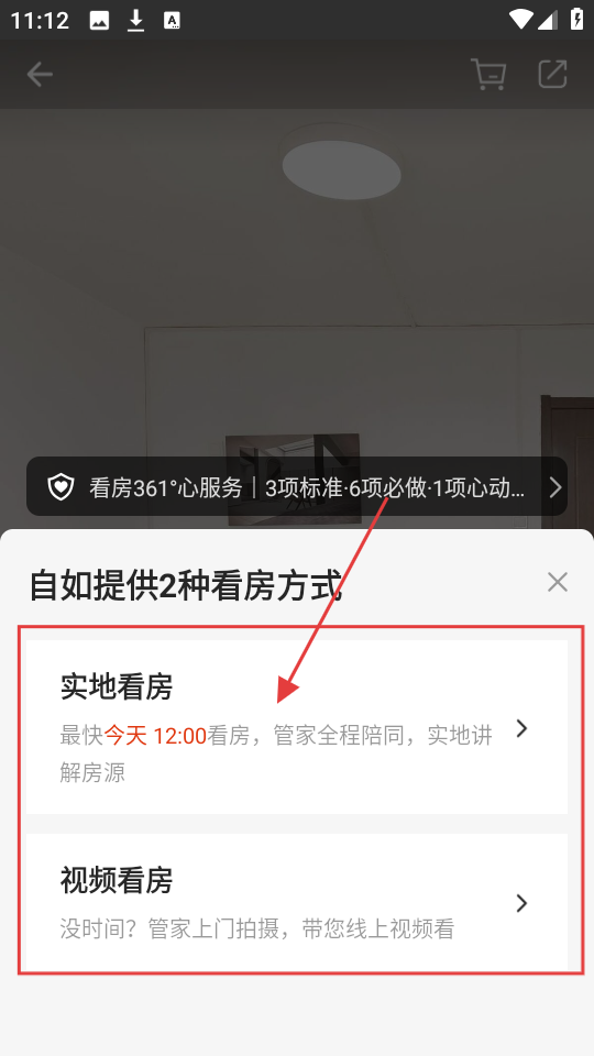 3、選擇看房方式,有【實(shí)地看房】和【視頻看房】可選,根據(jù)需求選就行哦。