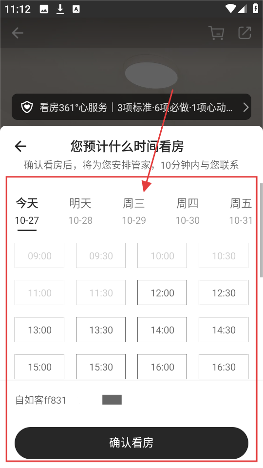 4、選好看房時(shí)間,比如今天10-27的某個(gè)時(shí)段,點(diǎn)擊【確認(rèn)看房】,就安排好啦。