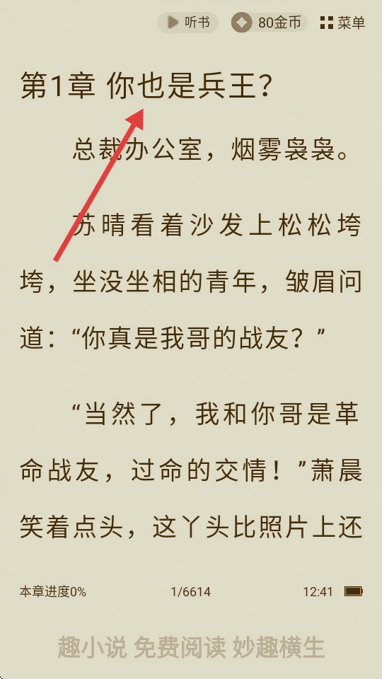 4、閱讀界面,可查看章節(jié)內(nèi)容,如【第1章你也是兵王?】,進(jìn)行閱讀。