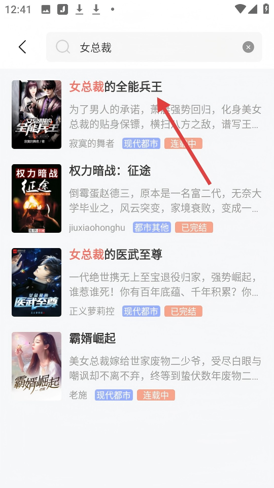 3、在搜索欄輸入【女總裁】,可找到【女總裁的全能兵王】等相關(guān)小說,點擊即可查看詳情。