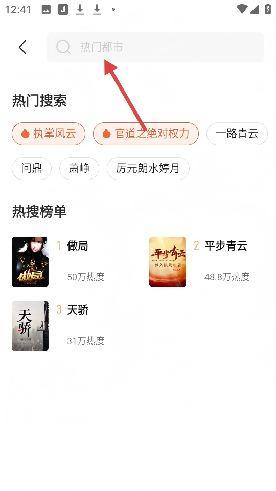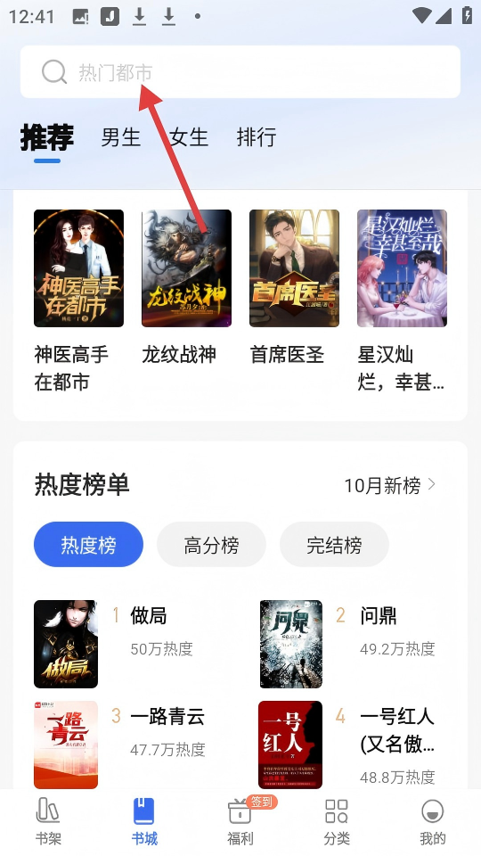 1、進(jìn)入書城,點擊頂部【熱門都市】搜索欄,可搜索小說。