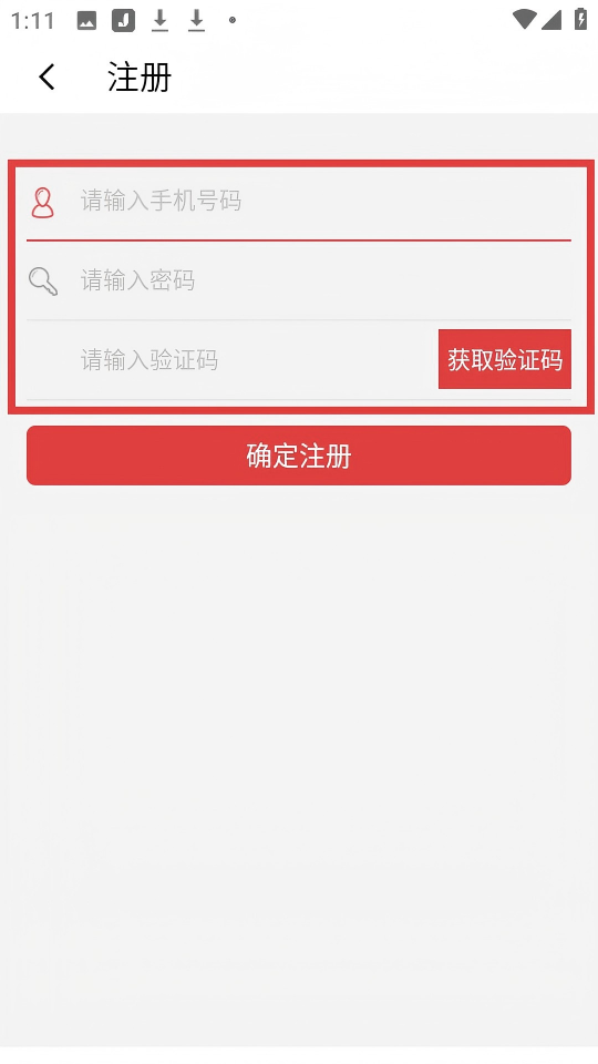 4、在注冊界面輸入【請輸入手機(jī)號碼】【請輸入密碼】,點擊【獲取驗證碼】并輸入后,點擊【確定注冊】可完成注冊。