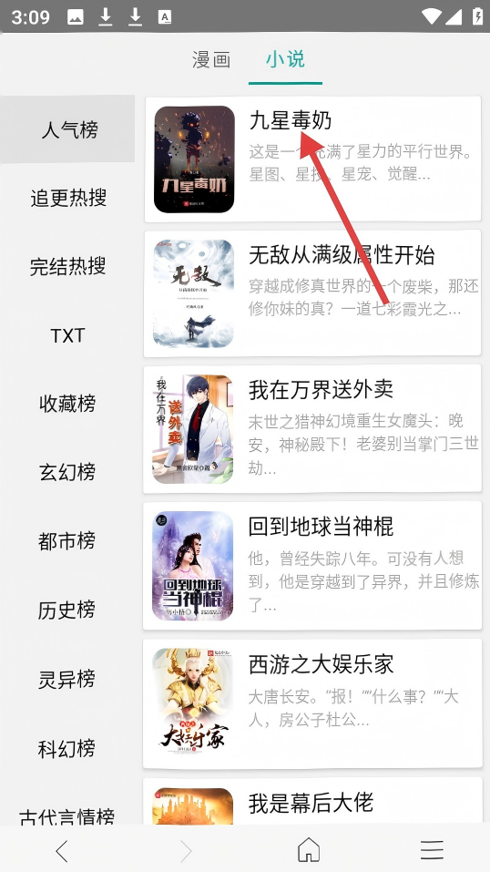 2、在小說熱搜的人氣榜中,點擊【九星毒奶】,進入搜索結(jié)果頁。