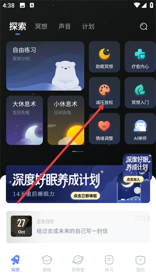 1、在探索頁面,點擊【減壓放松】功能入口,進入減壓放松模塊。