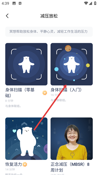 2、在減壓放松頁面,選擇【身體掃描(入門)】選項,進入該練習(xí)的詳情頁面。