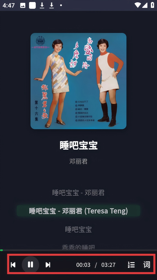 4、在播放界面,可通過(guò)底部控制欄操作播放,點(diǎn)擊【詞】可查看歌曲歌詞。