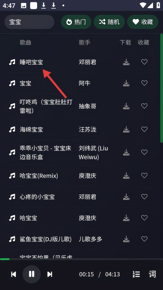 3、在搜索結(jié)果中,點(diǎn)擊【睡吧寶寶】歌曲條目,即可播放該歌曲。