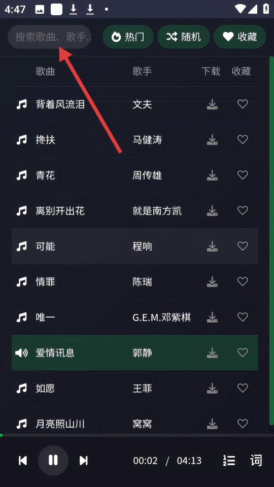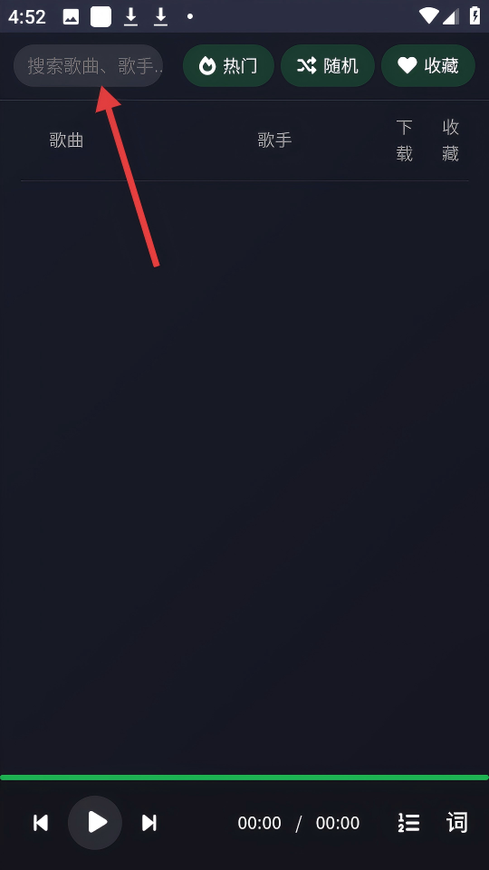 1、點(diǎn)擊頂部【搜索歌曲、歌手..】的搜索框,可輸入內(nèi)容搜索歌曲或歌手。