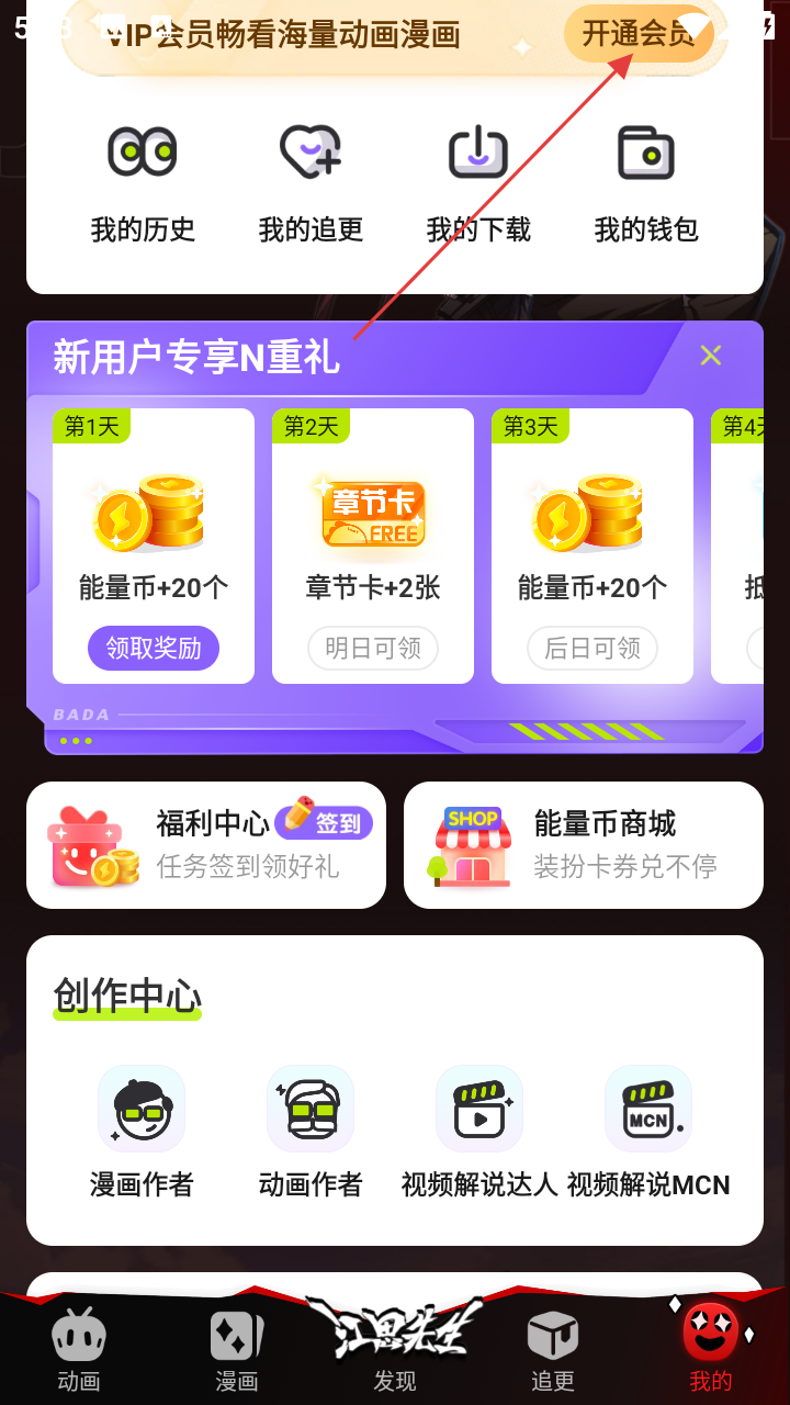 2、在【我的】頁面,點(diǎn)擊【開通會員】可進(jìn)入會員開通界面,還能使用我的歷史、我的追更等功能。