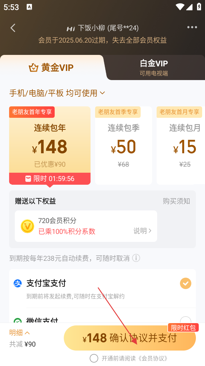 3、在會員開通界面,選擇會員類型和支付方式后,點(diǎn)擊【確認(rèn)協(xié)議并支付】即可進(jìn)入確認(rèn)開通環(huán)節(jié)。