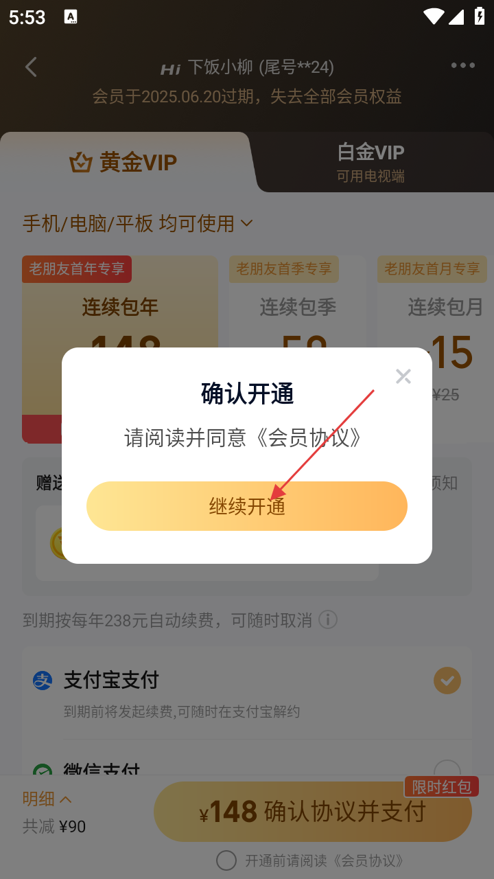 4、在確認(rèn)開通環(huán)節(jié),閱讀并同意《會員協(xié)議》后,點(diǎn)擊【繼續(xù)開通】即可完成會員開通操作。
