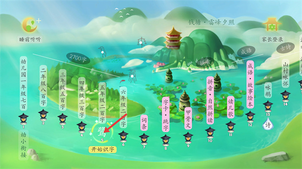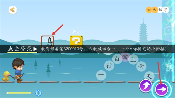 2、進(jìn)入識(shí)字游戲界面,通過(guò)射箭識(shí)字等互動(dòng)方式,結(jié)合古詩(shī)元素,提升識(shí)字趣味性。