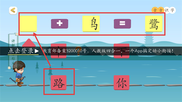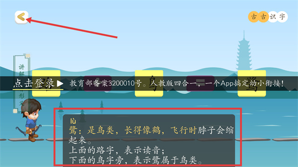 4、完成識(shí)字互動(dòng)后,可查看漢字釋義(如“鷺”是鳥類,路表音、鳥表義),深入理解漢字形義,輔助記憶。