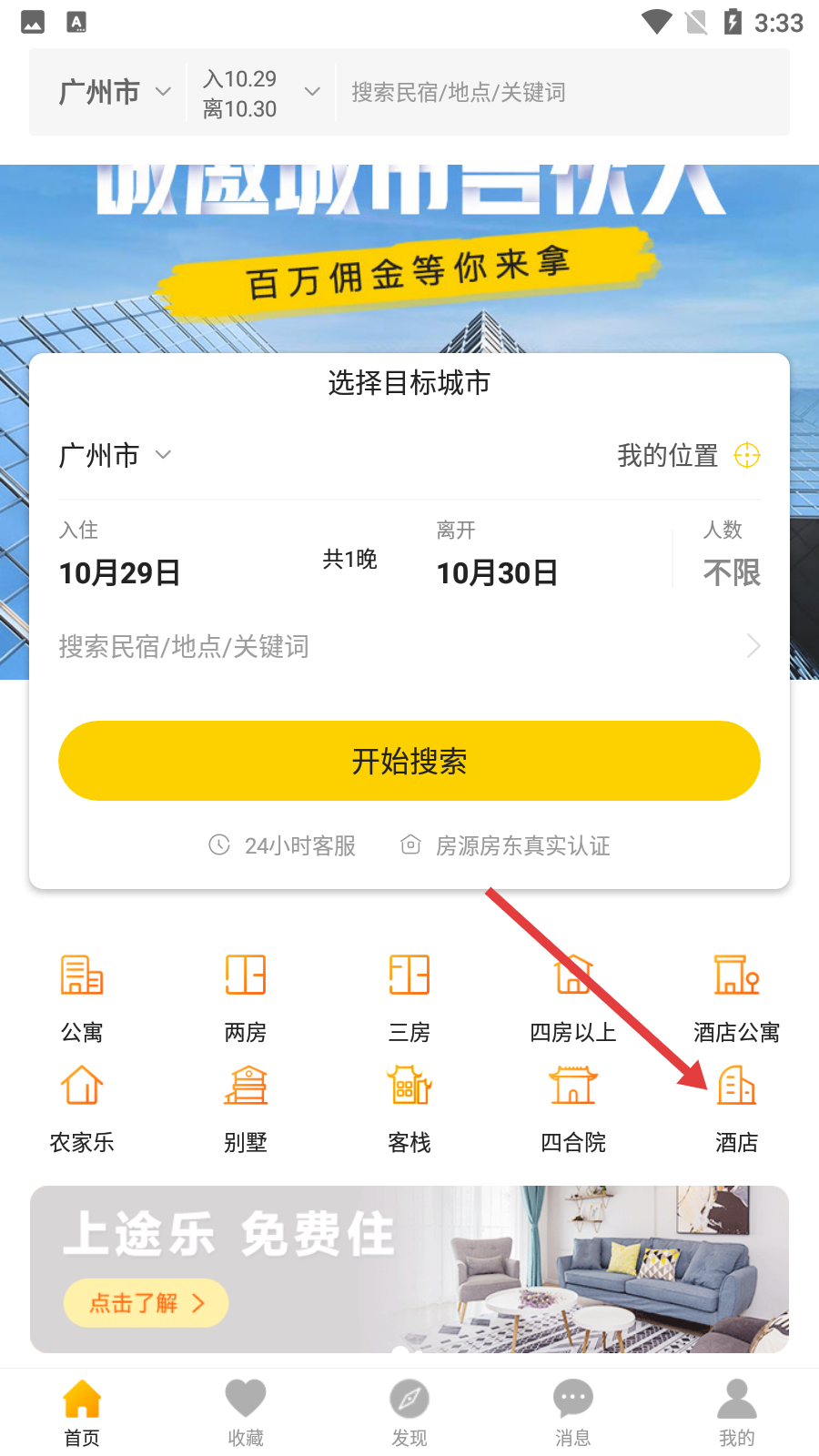 1、打開軟件,在主界面找到并點(diǎn)擊【酒店】。