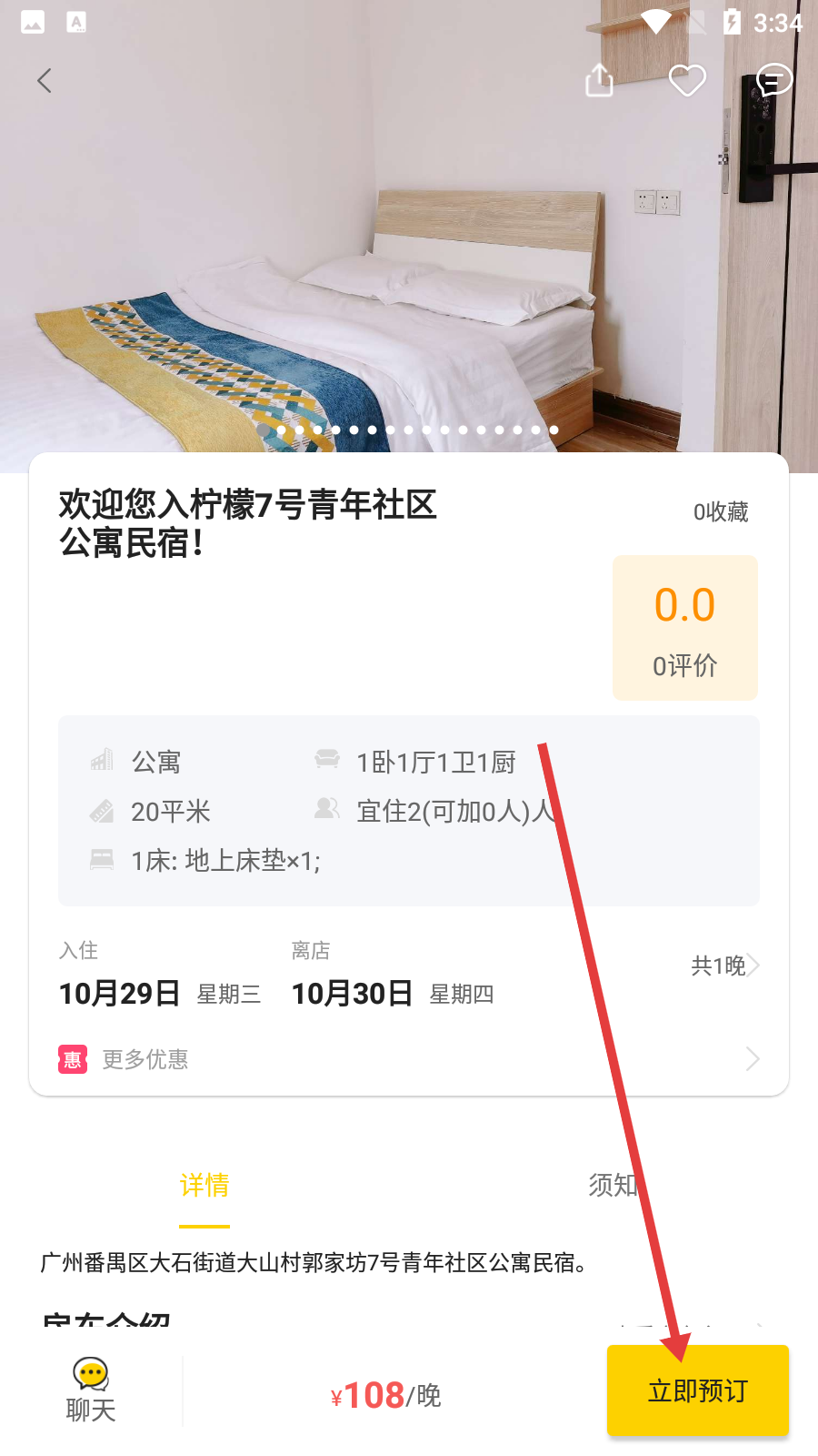 3、在民宿詳情頁,確認(rèn)入住信息后點(diǎn)擊【立即預(yù)訂】,進(jìn)入訂單填寫頁面。