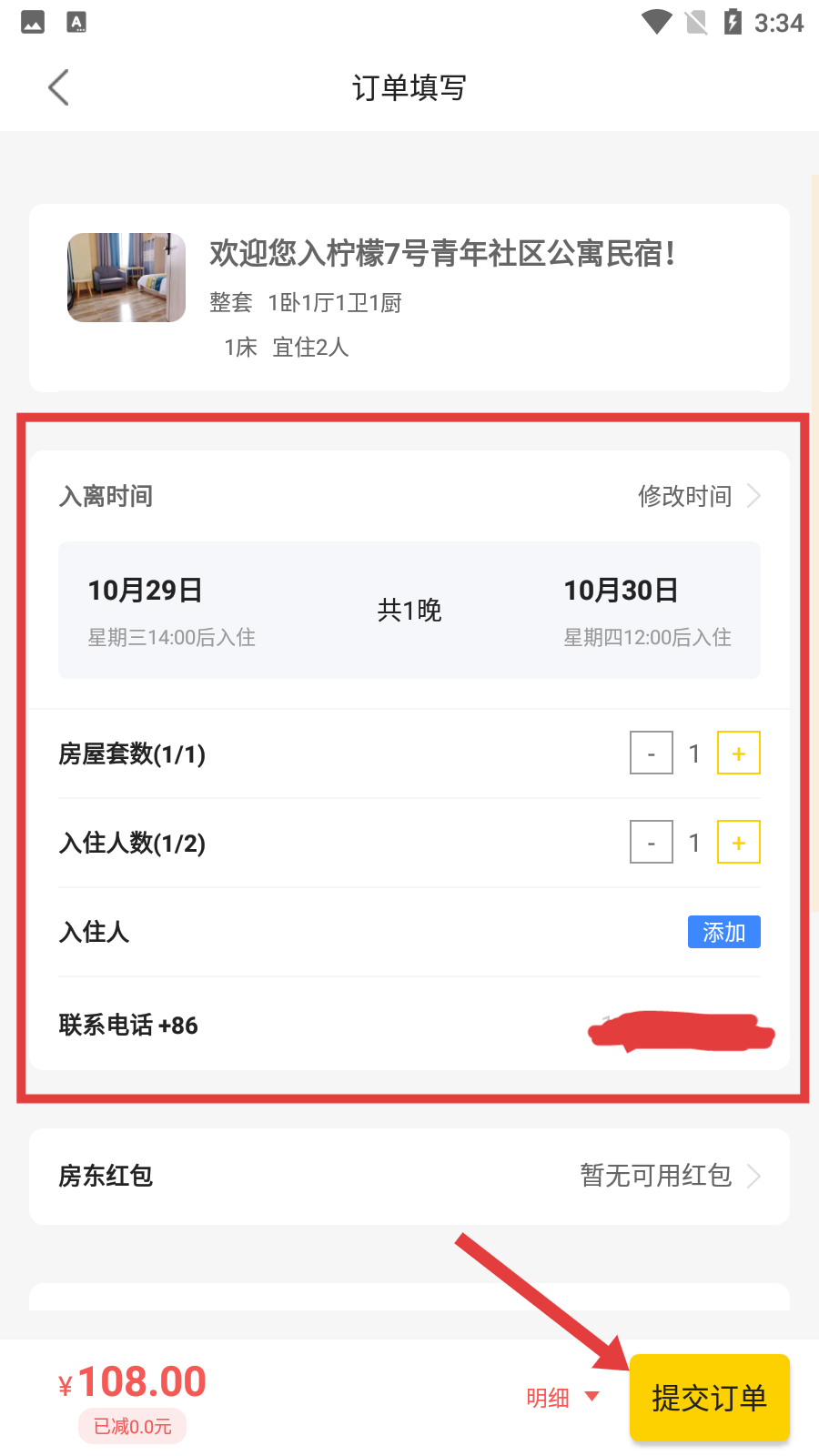 4、在訂單填寫頁,確認(rèn)入離時(shí)間、入住人數(shù)等信息后,點(diǎn)擊【提交訂單】,完成預(yù)訂流程。