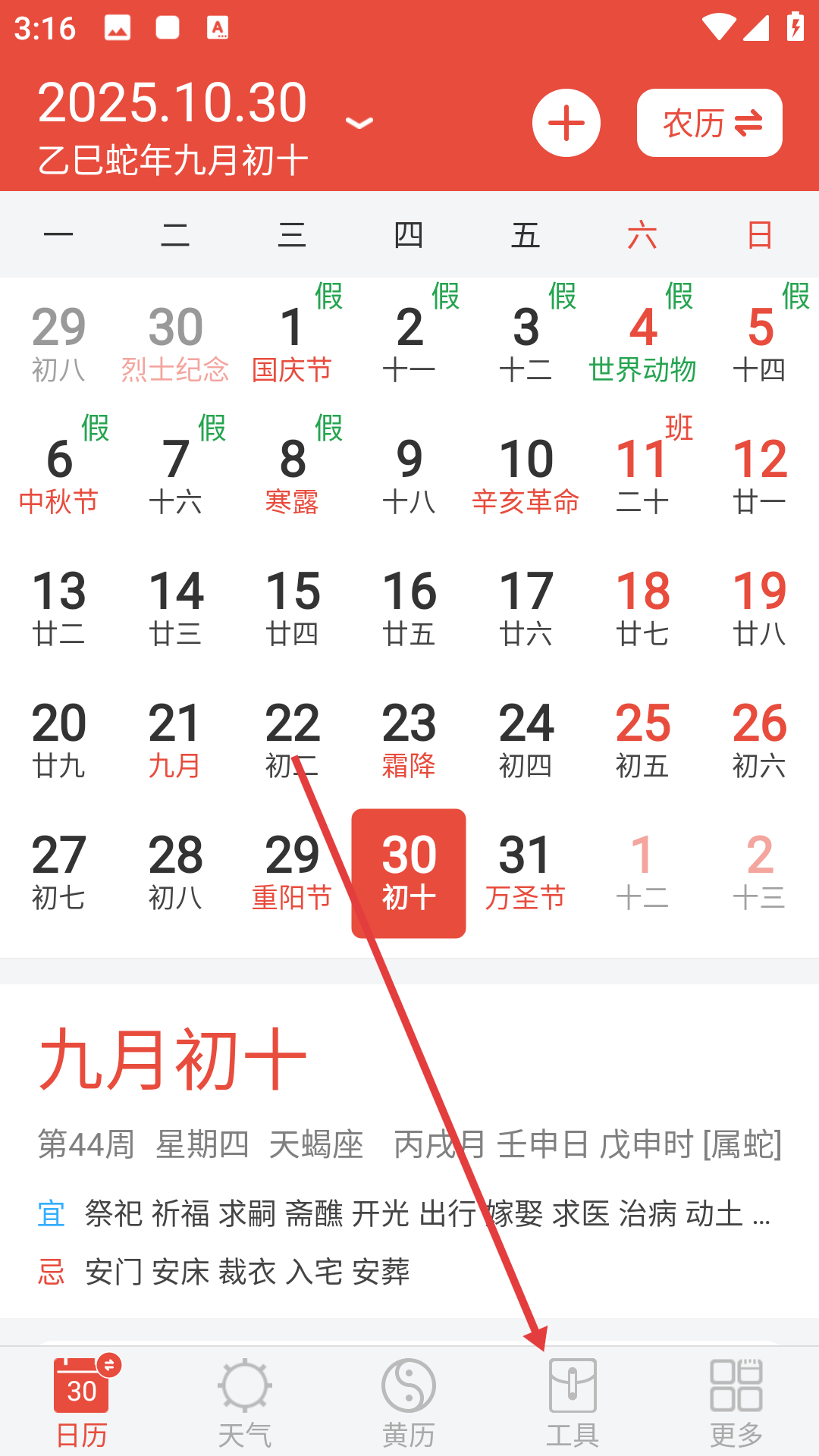 1、進(jìn)入日歷軟件后,點(diǎn)擊底部【工具】選項(xiàng),進(jìn)入工具頁(yè)面。