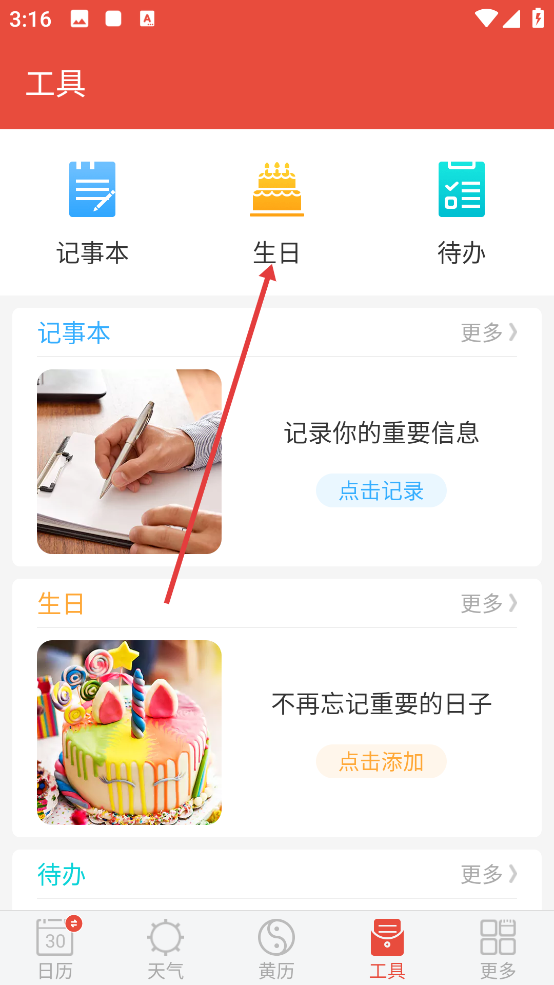 2、在工具頁(yè)面,點(diǎn)擊【生日】選項(xiàng),可進(jìn)入生日管理界面,方便記錄重要生日信息。