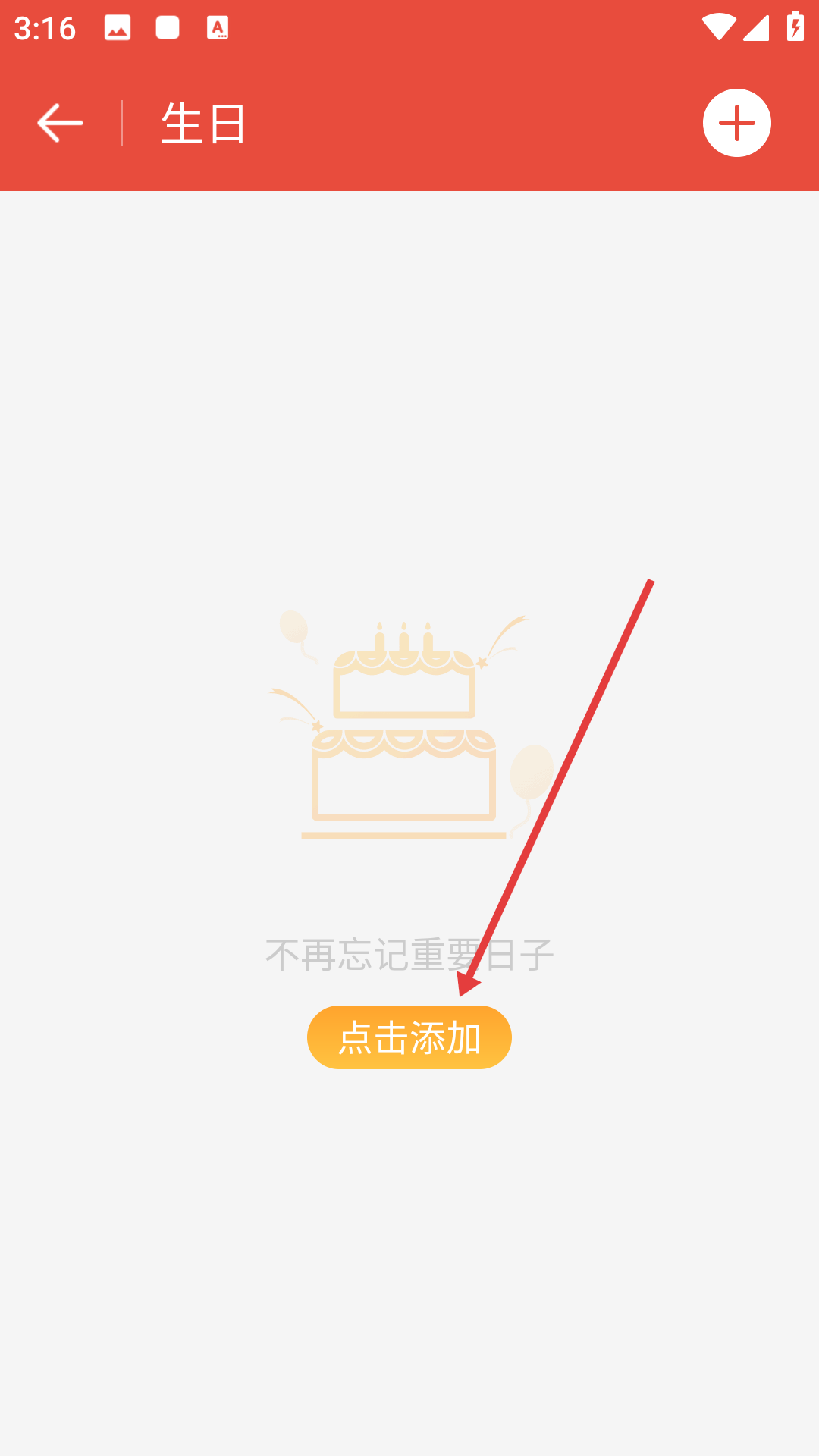 3、進(jìn)入生日頁(yè)面后,點(diǎn)擊【點(diǎn)擊添加】按鈕,可開(kāi)始新建生日記錄,避免忘記重要日子。