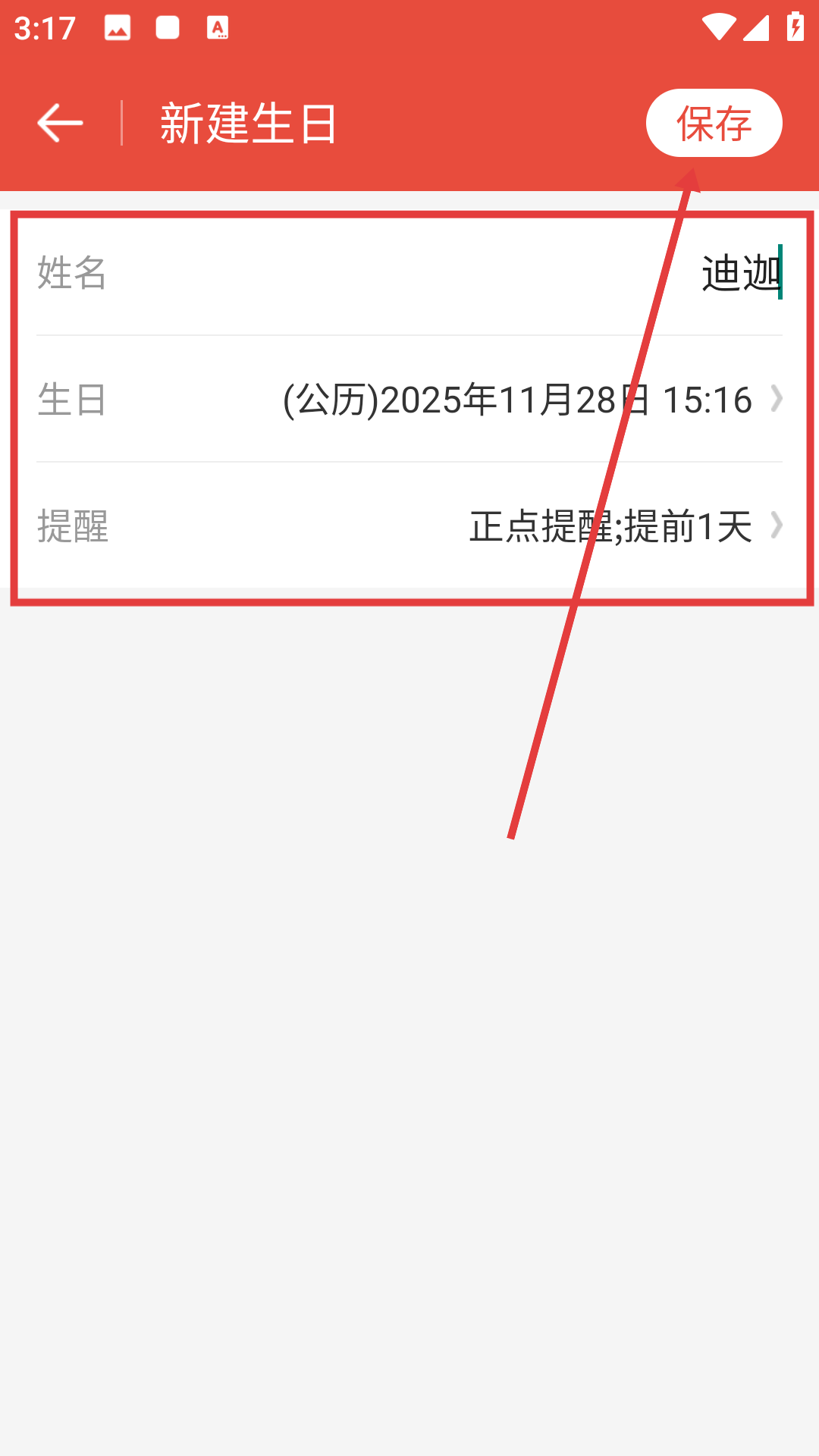 4、在新建生日頁(yè)面,填寫(xiě)姓名、生日時(shí)間、提醒方式后,點(diǎn)擊【保存】,即可成功記錄生日信息。
